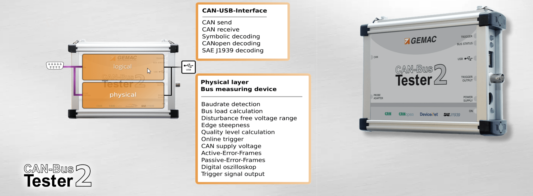 | Protocol monitor | CAN: Reception of CAN message frames incl. filtering, Transmission of CAN message frames and sequences (message lists) CANopen: Interpretation of all CAN messages according to the CANopen spec as SDOs, PDOs, NMT-, Heartbeat-, Emergency-, Sync- and Timestamp (CiA301, CiA302, CiA305, CiA401, CiA402, CiA404, CiA406, CiA408, CiA410, upgradeable) |